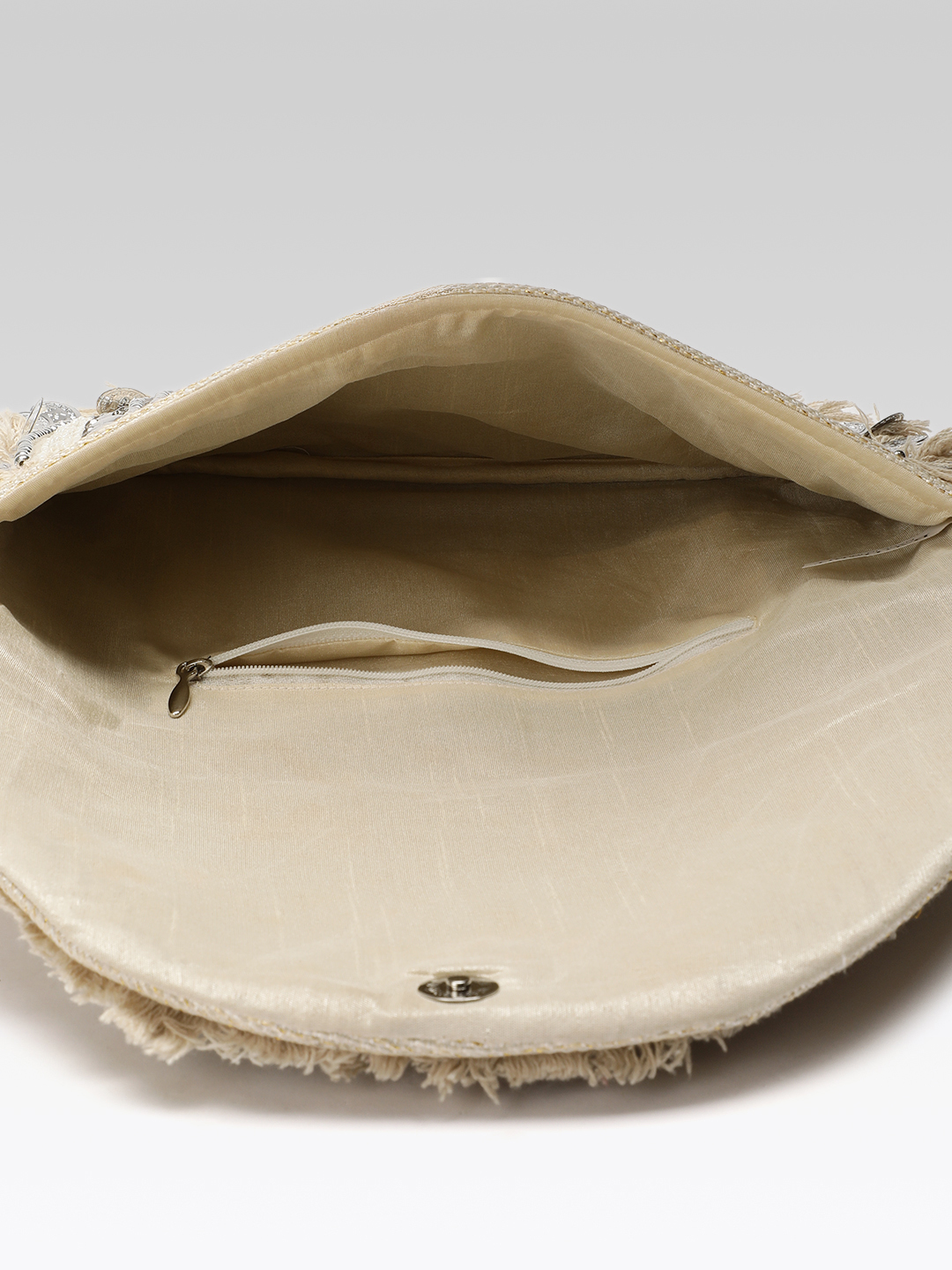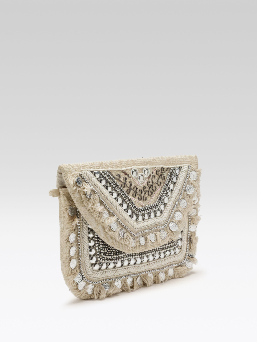 Crafted by skilled artisans, this handcrafted clutch reflects the beauty of tribal and ethnic embroidery, offering a luxurious feel without being heavy. The structured shape allows easy carrying of essentials like phone, cash, cards, lipstick, and keys, making it a practical yet stylish women clutch bag. The elegant off-white / beige neutral tone enhances its versatility, allowing it to match effortlessly with both bold and pastel outfits.